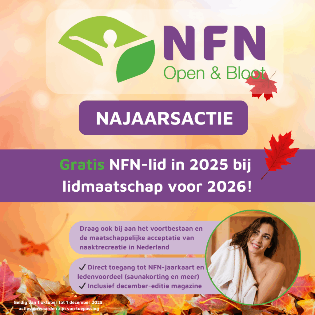 Ken je mensen die naaktrecreatie een warm hart toedragen maar nog geen NFN-lid zijn? Als je hen op het NFN-lidmaatschap attendeert en zij worden ook lid, dan ontvang jij een kortingscode ter waarde van € 5,- voor onze webshop (bij minimale besteding € 15,-). En degene die lid is geworden via jou, ontvangt een handige BlootKompas!-brochure. Op het registratieformulier lees je hoe dit werkt.